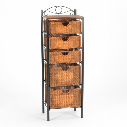 A perfect balance between function and design, this beautiful 5-drawer wicker storage unit accents any traditional décor. The black frame and cherry top are enhanced by the abundant wicker baskets. On the bottom, two larger baskets provide storage for larger items like bed sheets, toilet paper or dishes while the three smaller drawers above are perfect for magazines, silverware and spices. The large baskets measure 11" W x 14" D x 8.5" Tall and the small baskets measure 11" W x 14" D x 5" Tall. Slender enough for almost any space, this wicker storage unit is sure to add a creative storage solution to any room.RelateItems